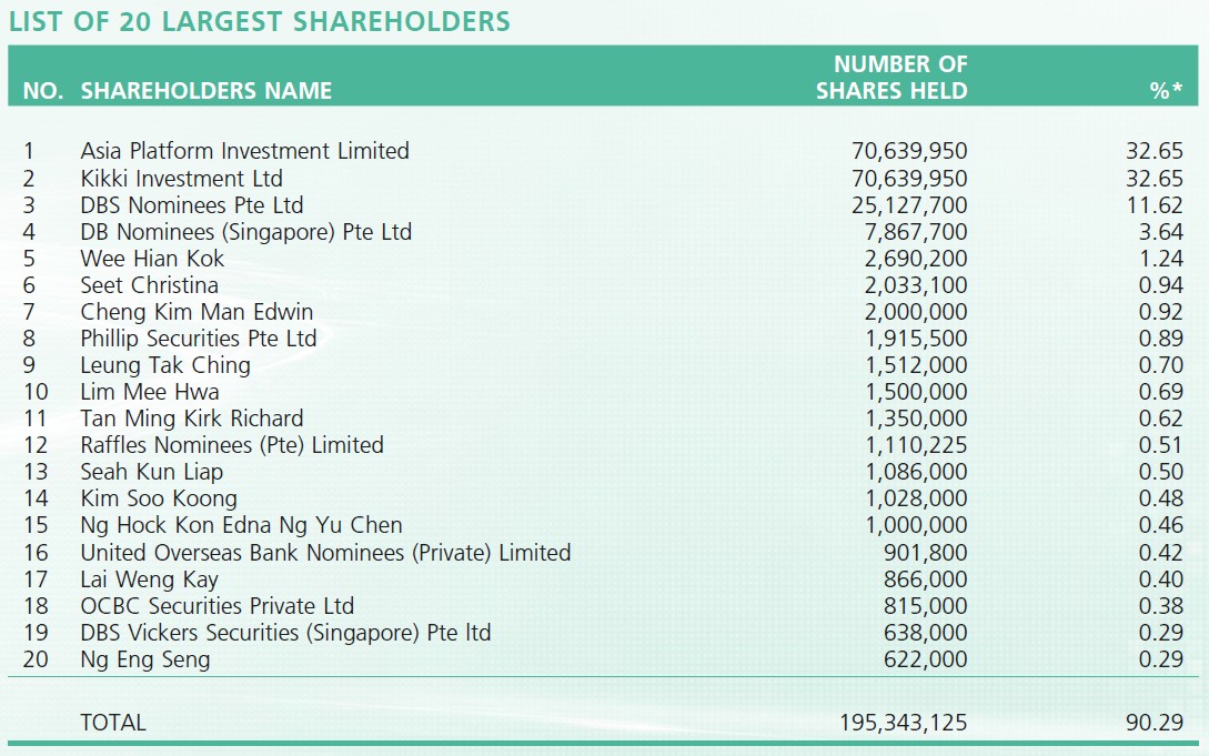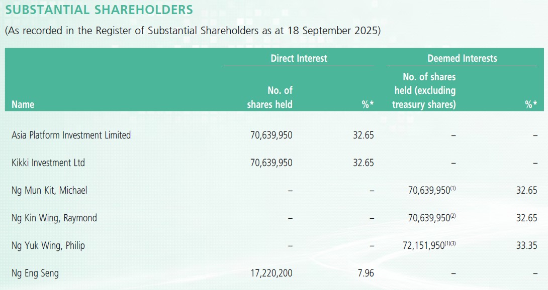 Asia Platform Investment Limited is an investment holding company which is owned by Mr. Ng Mun Kit, Michael and Mr. Ng Yuk Wing, Philip.